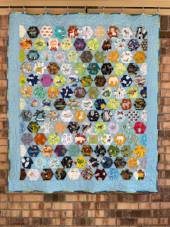 I made this quilt for Ryan and Alaina Parkerson. I taught Ryan my first two years at Winona High and I taught Alaina two years too, When I moved here my principal, Charlie Parkerson, said Ryan (his son) was available to do odd jobs if I needed help. He painted the interior of my shed, helped remove wallpaper, and some other tasks at my house. He was a wonderful worker and student. More importantly I was so impressed with how willing he was to invite people to church and tell about the programs that they were running. He would also tell me whenever there was a home ball game, so if I didn't have duty I could plan to come. Even tho we are given a calendar, I often just get into the academic calendar that I needed the reminder and I was glad he did that. Alaina was a student that had to work at it to do well in math, but I was impressed about how hard she worked and ended up pulling one of the top grades. Anyway I texted Charlie when I heard they were expecting. Charlie texted me that they were doing a zoo animal theme and light blue for the nursery. So when I was in San Diego celebrating my retirement, Celeste and I decided to ride out to El Cajon and go to a quilt shop there. We picked up a few more cute fabrics and found a perfect blue for the border and triangles and a great blue piece for the back and even tho it was dinosaurs it was so cute we picked it. I had a lot of fun curating the different animal prints on this quilt and I put a row at the bottom to represent the things the parents and grands were interested in.Hope they love giving little Jaxon Cole tummy time on the quilt.